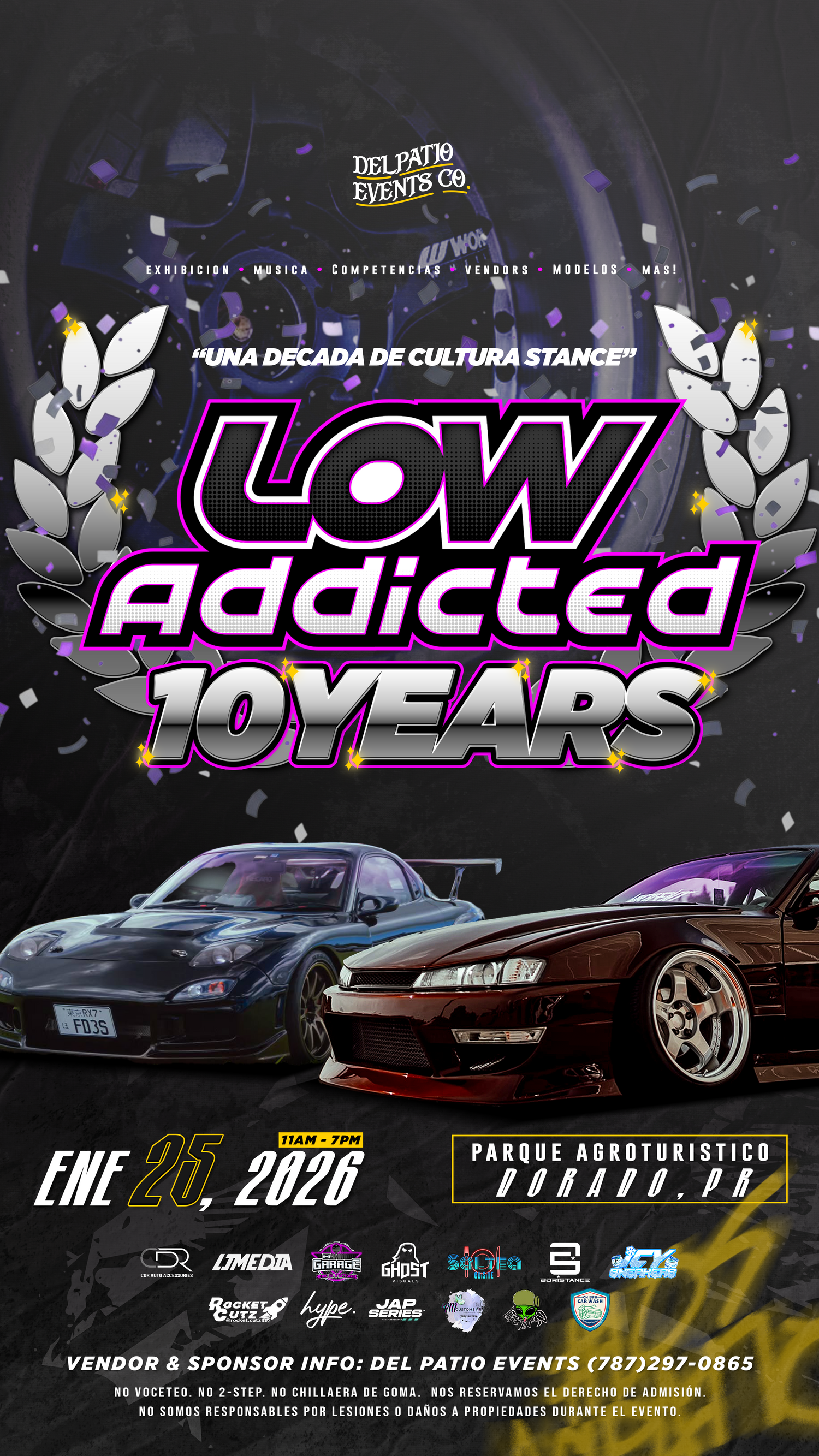 LowAddicted The Event '26 es nuestro clásico evento que a demostrado año tras año ser el mas grandes al exterior para TODO TIPO DE AUTOS en PR. Es el evento para todas las modalidades mas esperado del año, donde le damos el comienzo con el verdadero sazón. Ven y celebra con nosotros nuestros 10 años.